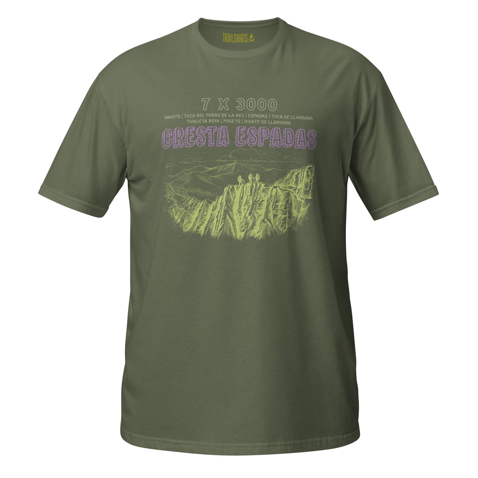 Con un diseño ilustrado técnico en el pecho, presenta la impresionante Cresta Espadas dibujada con trazos finos tipo sketch mostrando las agujas rocosas características con tres siluetas de montañeros en la cresta. En la parte superior, «7 X 3000» proclama el desafío. Debajo, el listado completo de las siete cumbres: Pavots, Tuca del Forau de la Neu, Espadas, Tuca de Llardana, Turqueta Roya, Posets y Diente de Llardana. «CRESTA ESPADAS» en tipografía bold vintage completa el diseño.
