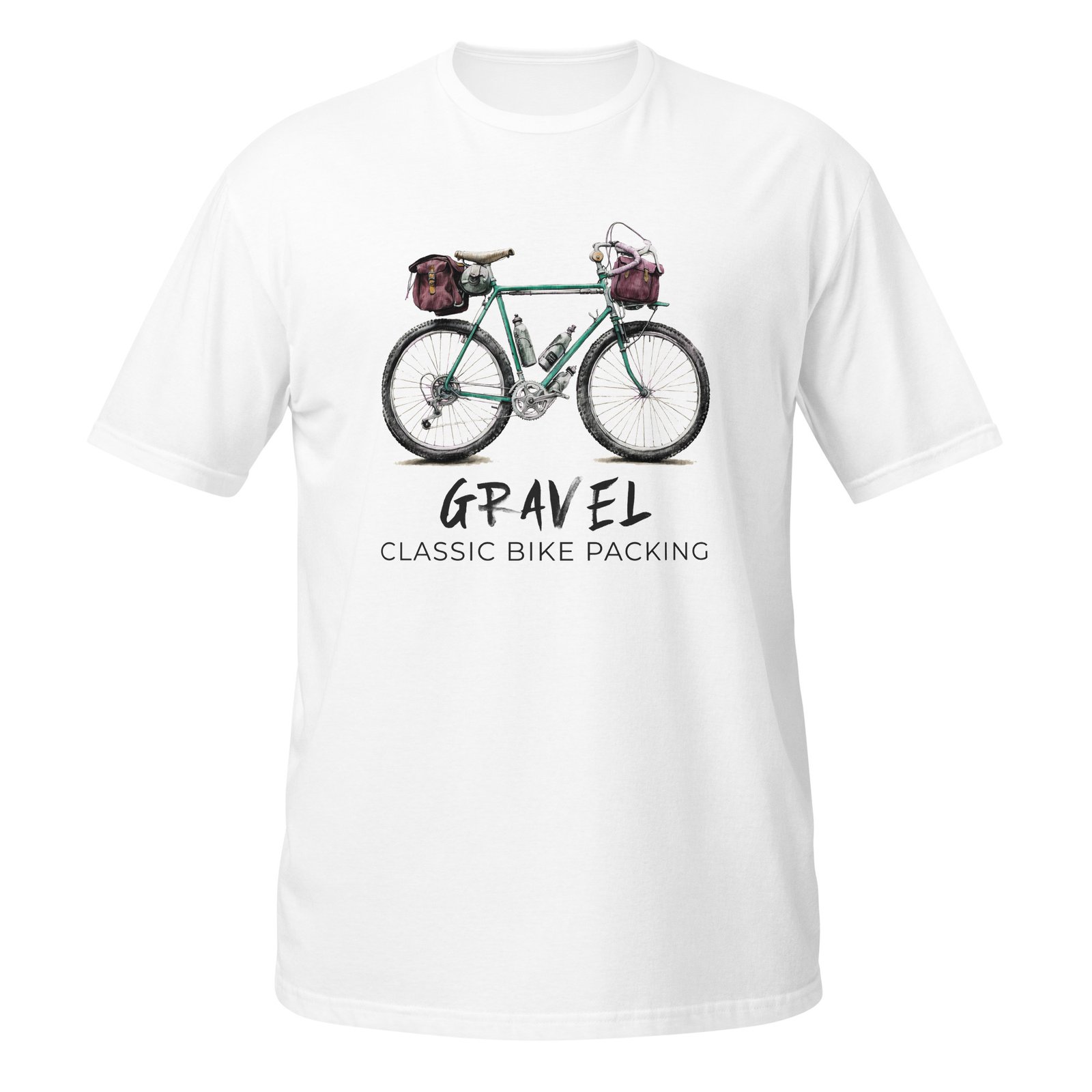 La camiseta presenta un dibujo detallado de una bicicleta clásica de gravel bikepacking, lista para afrontar cualquier desafío. Debajo, la inscripción GRAVEL CLASSIC BIKE PACKING en letras grandes deja clara tu afición por este estilo de ciclismo tan especial.