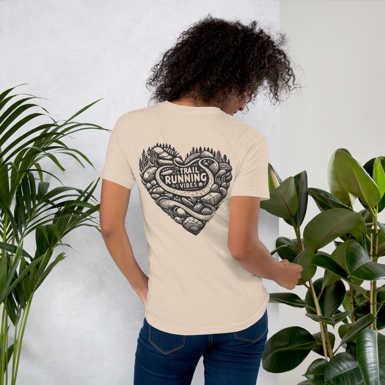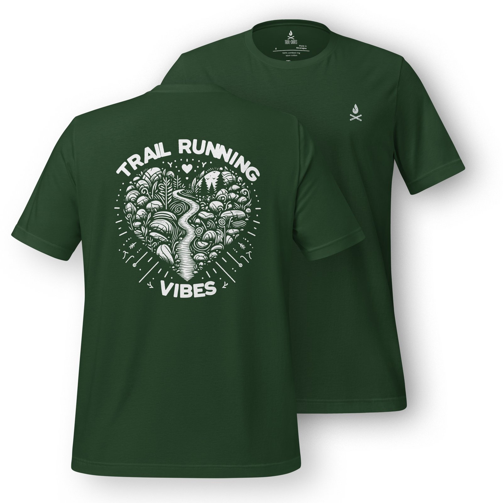 El lema «Trail Running Vibes» se encuentra en el centro del corazón, reforzando tu amor por este deporte. La ilustración es visualmente atractiva y está repleta de detalles que deleitarán a los corredores más entusiastas.