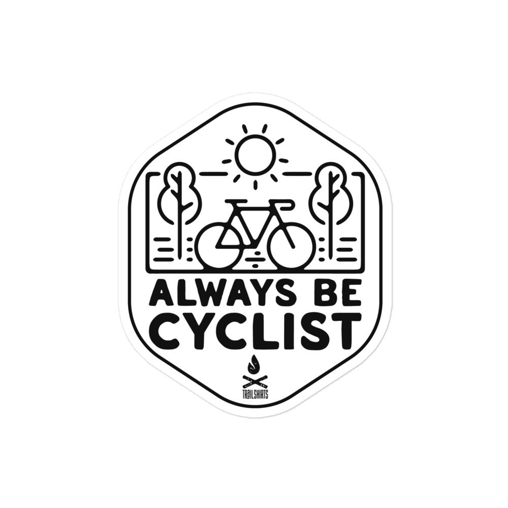 Con el diseño gráfico icónico en formato hexagonal, esta pegatina presenta una ilustración geométrica minimalista de una bicicleta rodeada de árboles y un sol radiante, todo enmarcado en elegante trazo negro con el potente mensaje «ALWAYS BE CYCLIST» en tipografía bold. En la base, el logo TrailShirts certifica la autenticidad del diseño.