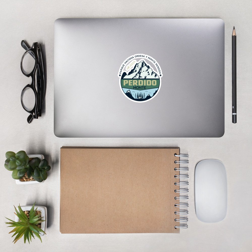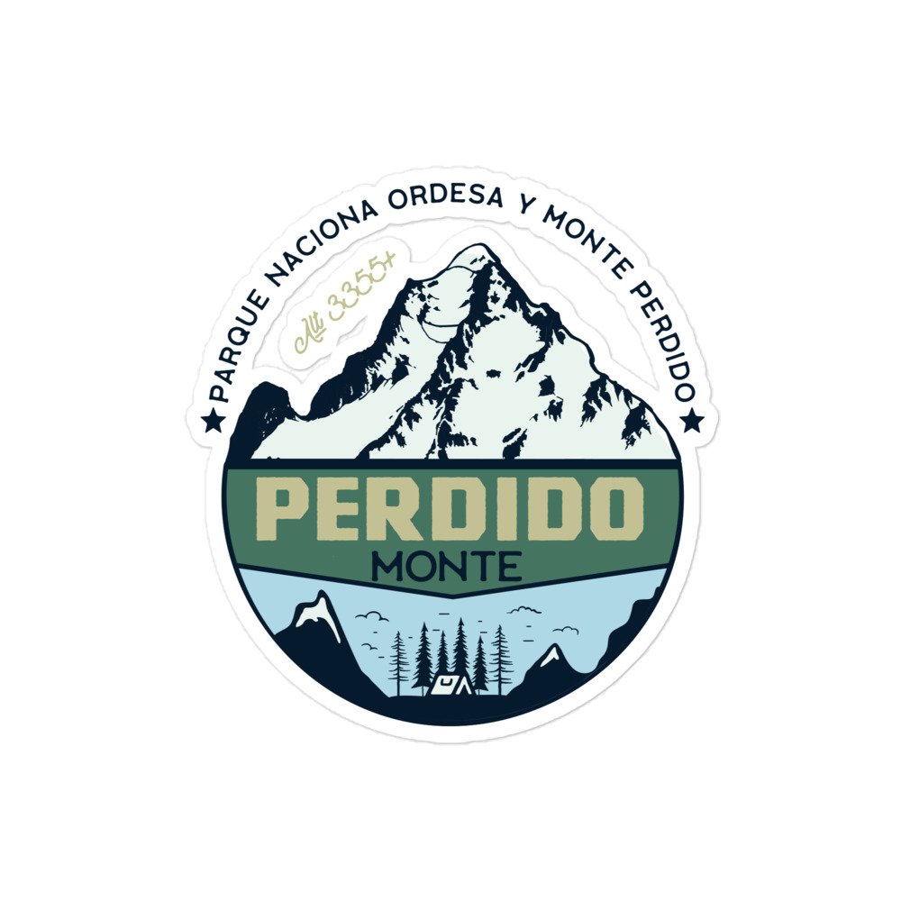 Pegatina que hace mención al Monte Perdido (en aragonés As Tres Serols) es el macizo calcáreo más alto de Europa. Se encuentra situado dentro de la vertiente sur del Pirineo central, al norte de la provincia de Huesca, en el parque nacional de Ordesa y Monte Perdido, en la comunidad autónoma de Aragón (España). Su pico más elevado es el Monte Perdido con una altitud de 3355 metros sobre el nivel del mar.
