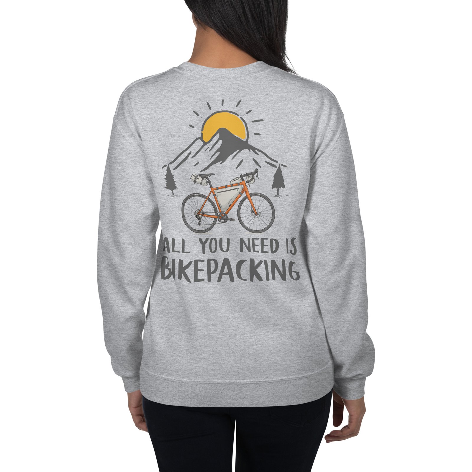 La sudadera unisex «All You Need is Bikepackin'» es la prenda perfecta para viajeros sobre dos ruedas que entienden que la verdadera libertad se encuentra en una bicicleta cargada y un camino sin fin por delante.
