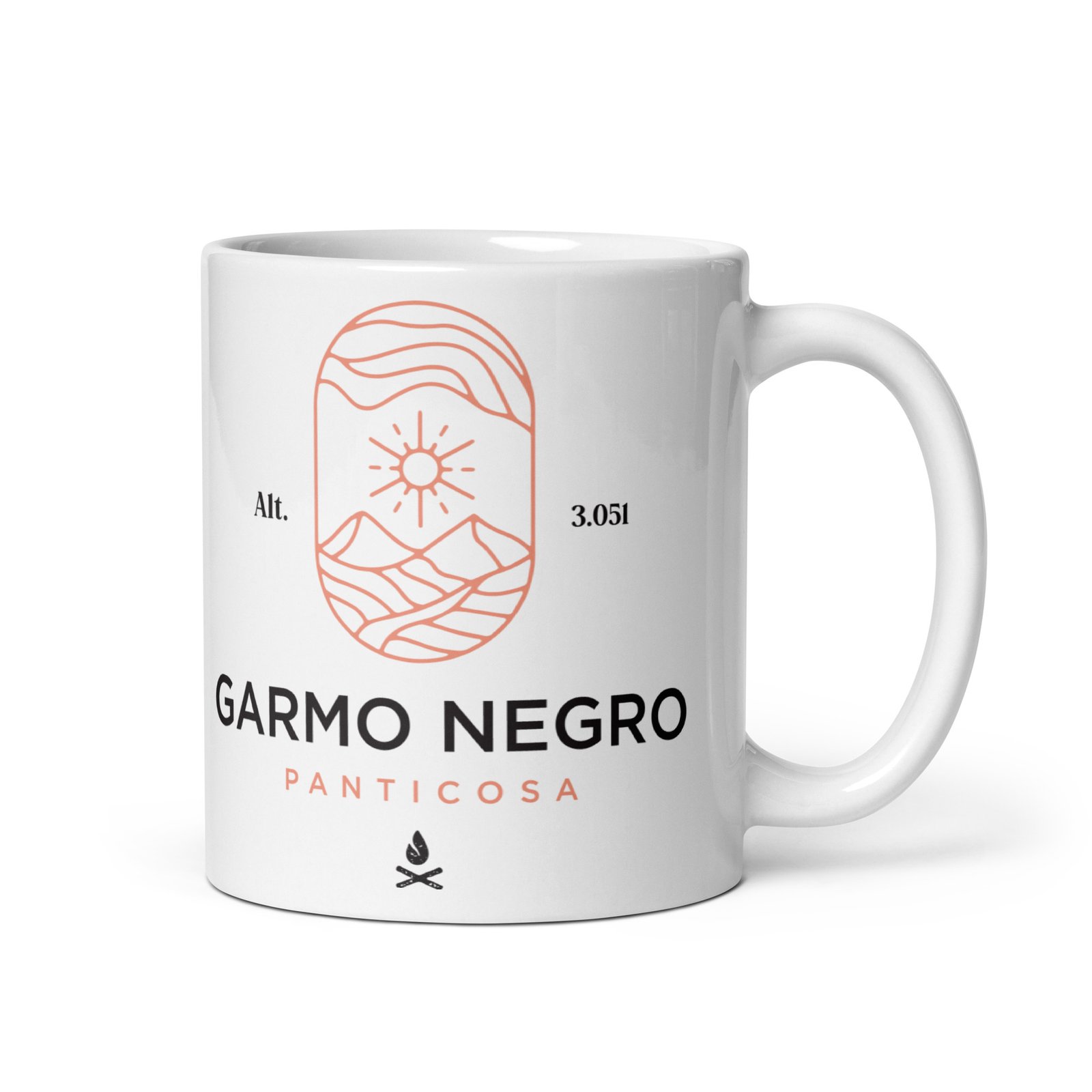 La taza presenta una ilustración minimalista que representa la silueta del Garmo Negro con el sol en lo alto, enmarcada en un óvalo con la inscripción «GARMO NEGRO» en la parte inferior. Debajo, se encuentra la palabra «Panticosa», haciendo referencia al valle donde se encuentra ubicado este majestuoso pico.