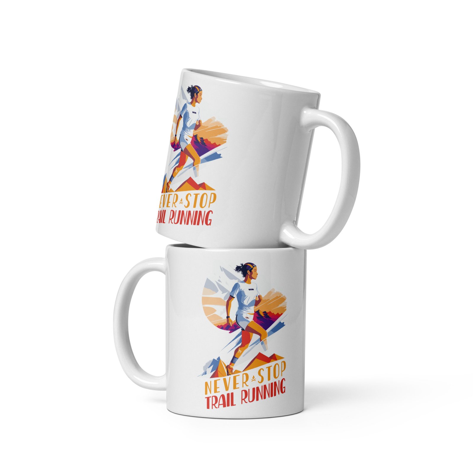 El diseño de esta taza es verdaderamente único. La silueta de una corredora de montaña captura la fuerza y la determinación necesarias para conquistar los senderos más desafiantes. Con colores claros y un acabado brillante, esta taza resalta su estilo y personalidad.