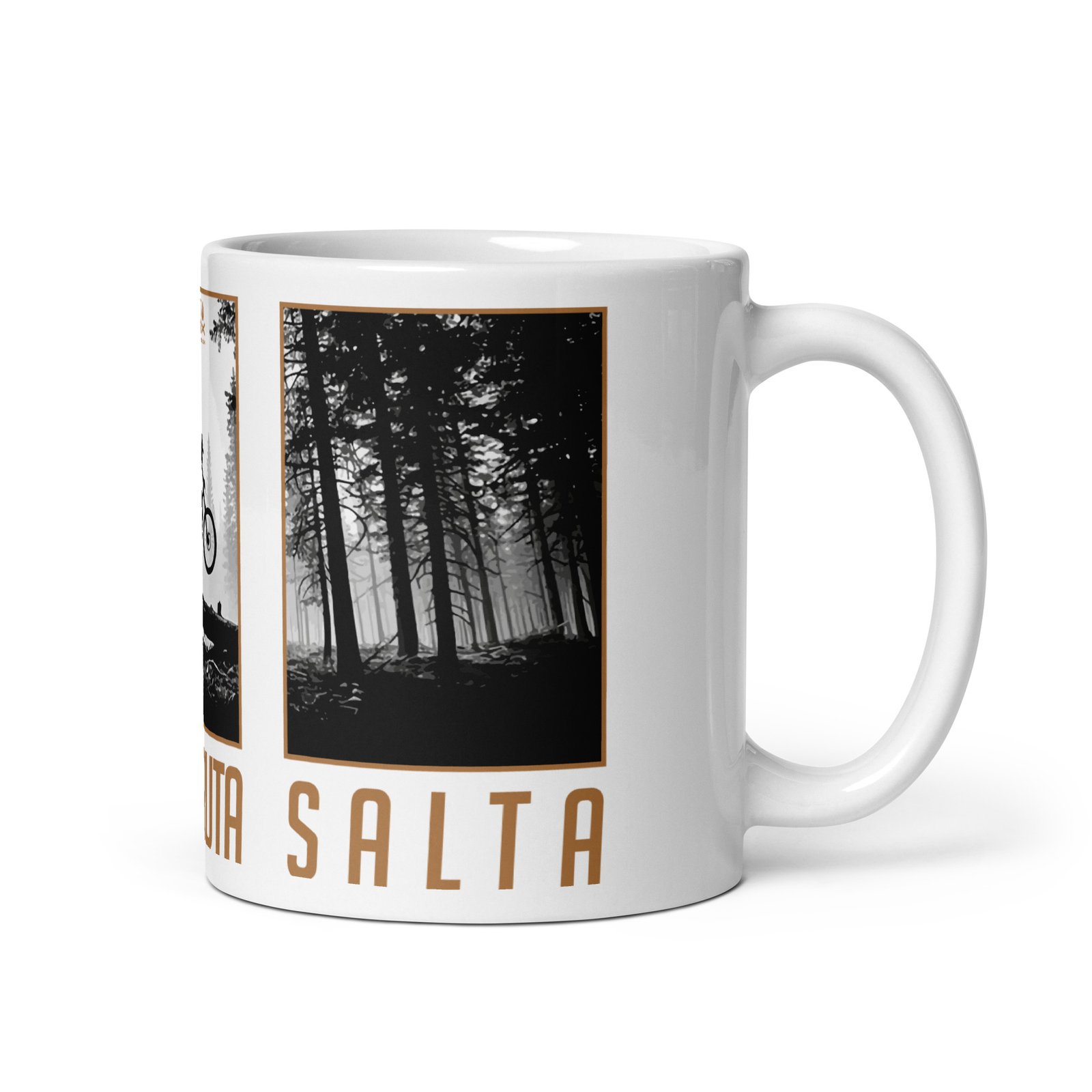 Las tres escenas fotográficas en blanco y negro fluyen alrededor de la taza: ciclista preparándose, momento cumbre del salto y bosque místico. El mensaje «SIENTE DISFRUTA SALTA» en letras bronce conecta cada panel, recordándote la filosofía MTB cada mañana.